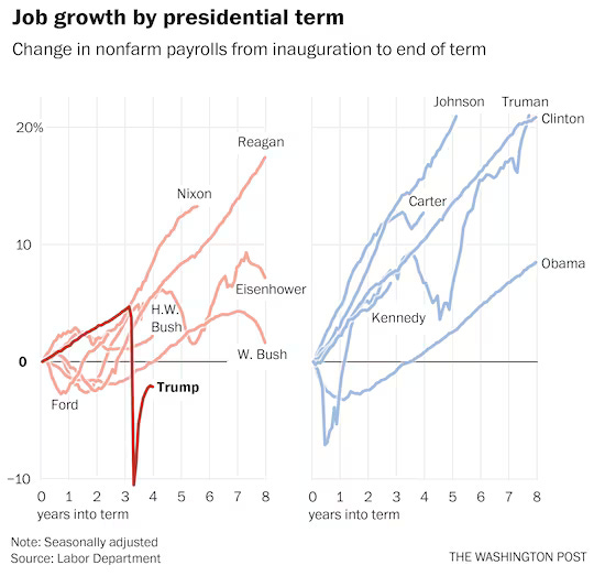 First, we had the first loss of jobs since Herbert Hoover. Donald Trump losing over 2.7 million jobs during the COVID epidemic, none of which had rebounded by the time Joe Biden took office. Important to note that even pre-COVID Trump largely under performed his predecessor in job creation. Unemployment rate spiked to almost 15% in 2020, and was setting above 6% when Biden took office.