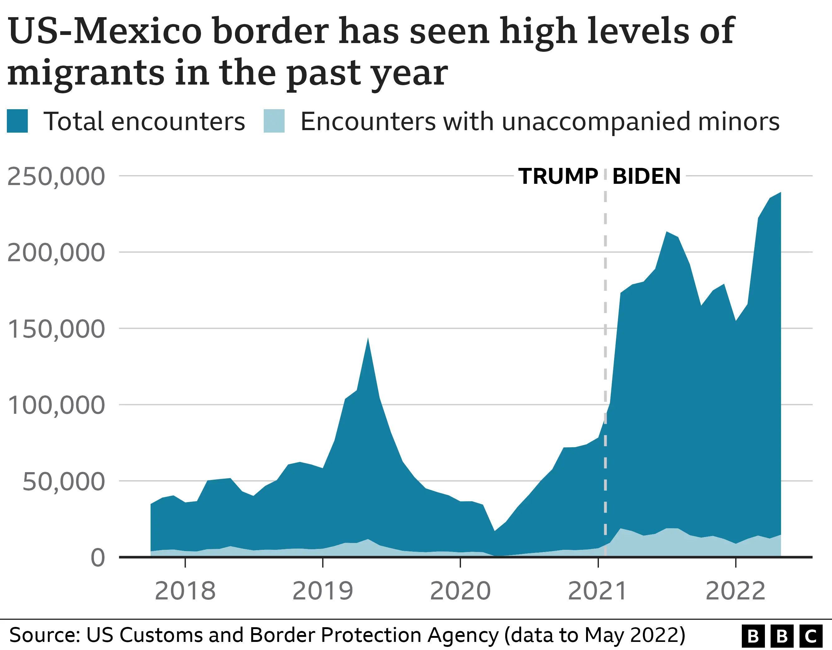 Crossings first spiked to almost 1 million in 2019, where Trump touted a higher catch and release rate than Biden ever would during his 4 years. Then as seen in the below graph, border crossings began spiking again toward the end of 2020. Showing Trump never secured the border, but instead was saved by COVID from having the issues highlighting under mind.