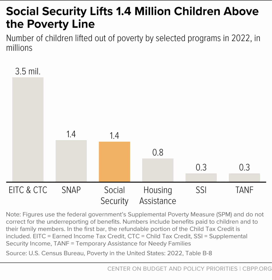 After the Earned Income Tax Credit and Child Tax Credit, no system lifts more children out of poverty than Social Security. Over 5.7 million children live in homes that receive Social Security benefits. This includes over 2.6 million who receive benefits as dependents of retired, disabled, or deceased workers.