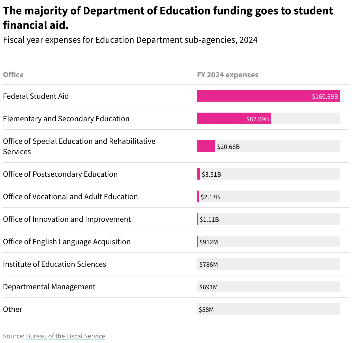 The largest make-up of what the Department of Education does is handle student loans and helping financials for those applying to college. One example of this is the Free Application for Federal Student Aid or FAFSA.