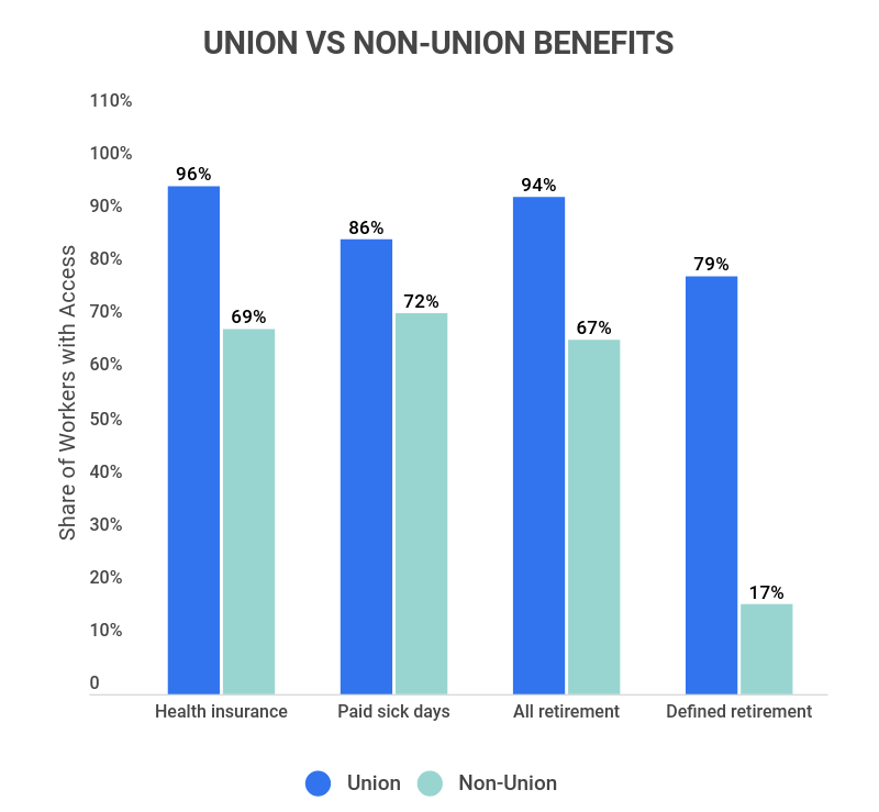 Studies show union members have higher rates of insurance, and more access to health care measures. Data also supports the claim that union members typically receive more paid sick days in the same industries.