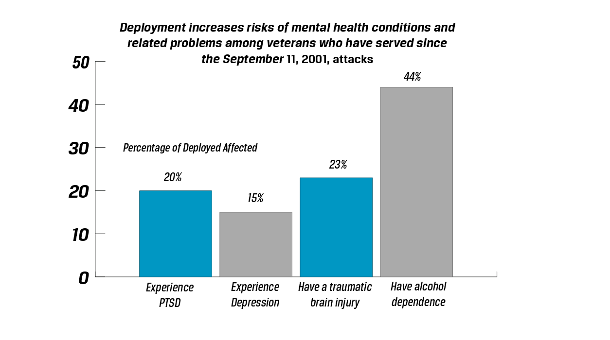 60% of veterans have some sort of musculoskeletal ailment, with studies showing more than 1-4 veterans will suffer from PTSD, depression, substance use disorders, anxiety, or some other serious mental illness. Also, schizophrenia is a commonly diagnosed mental illness among veterans.